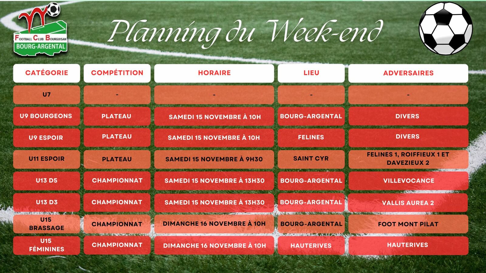 Tout le monde sera sur les terrains, hormis les U7 et les équipes seniors fanions Masculines et Féminines.![]()