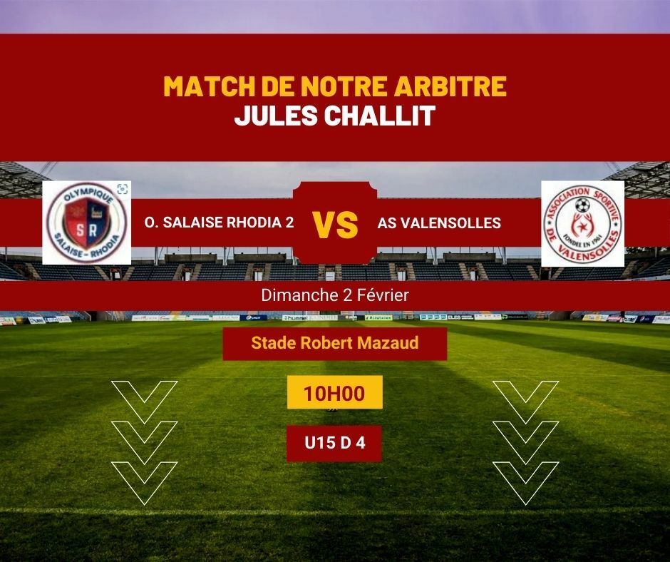Ce dimanche, Jules sera du côté de Salaise, afin d'arbitrer la réserve de l'Olympique Salaise Rhodia qui joueront contre Valensolles, dans le Championnat U15 D4.