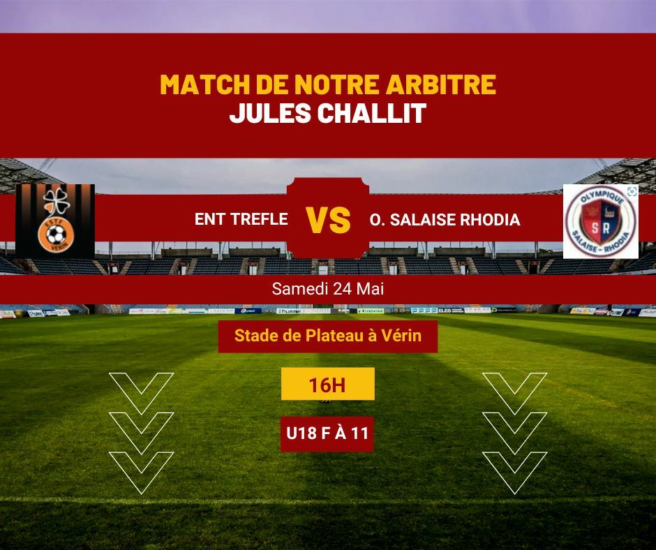 Notre arbitre sera samedi, du côté de Vérin, afin d'officier son dernier match de la saison, opposant les U18 Féminines, de trèfle contre celle de l'Olympique Salaise Rhodia.