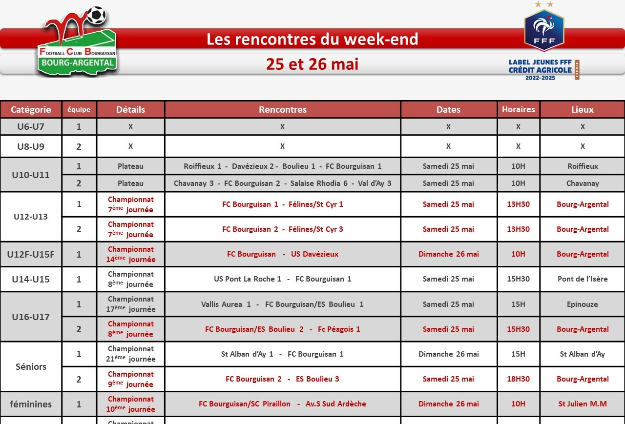 Vous trouverez dans l'image Ă droite tous le matchs prĂ©vu ce week-end !Â